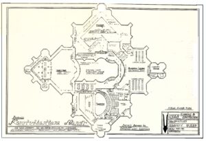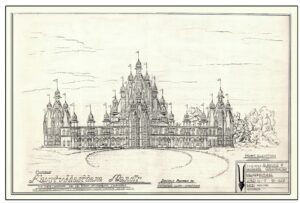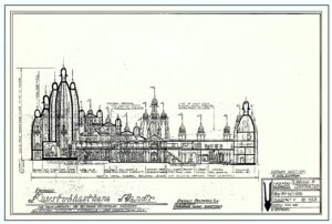 At one point New Vridaban rose up to be one of the most dynamic outlet for presenting Krishna Consciousness. There was a vision to build a magnificent majestic temple and I was inspired to design what I felt would be a wonderful temple that included a theater, restaurant and book store. These are the architectural proposal drawing for building that temple which was unfortunately came too late to be given serious consideration. They are presented here for anyone in the future who may want to build such a wonderful monument for the glorification of the Supreme Lord Sri Krishna!